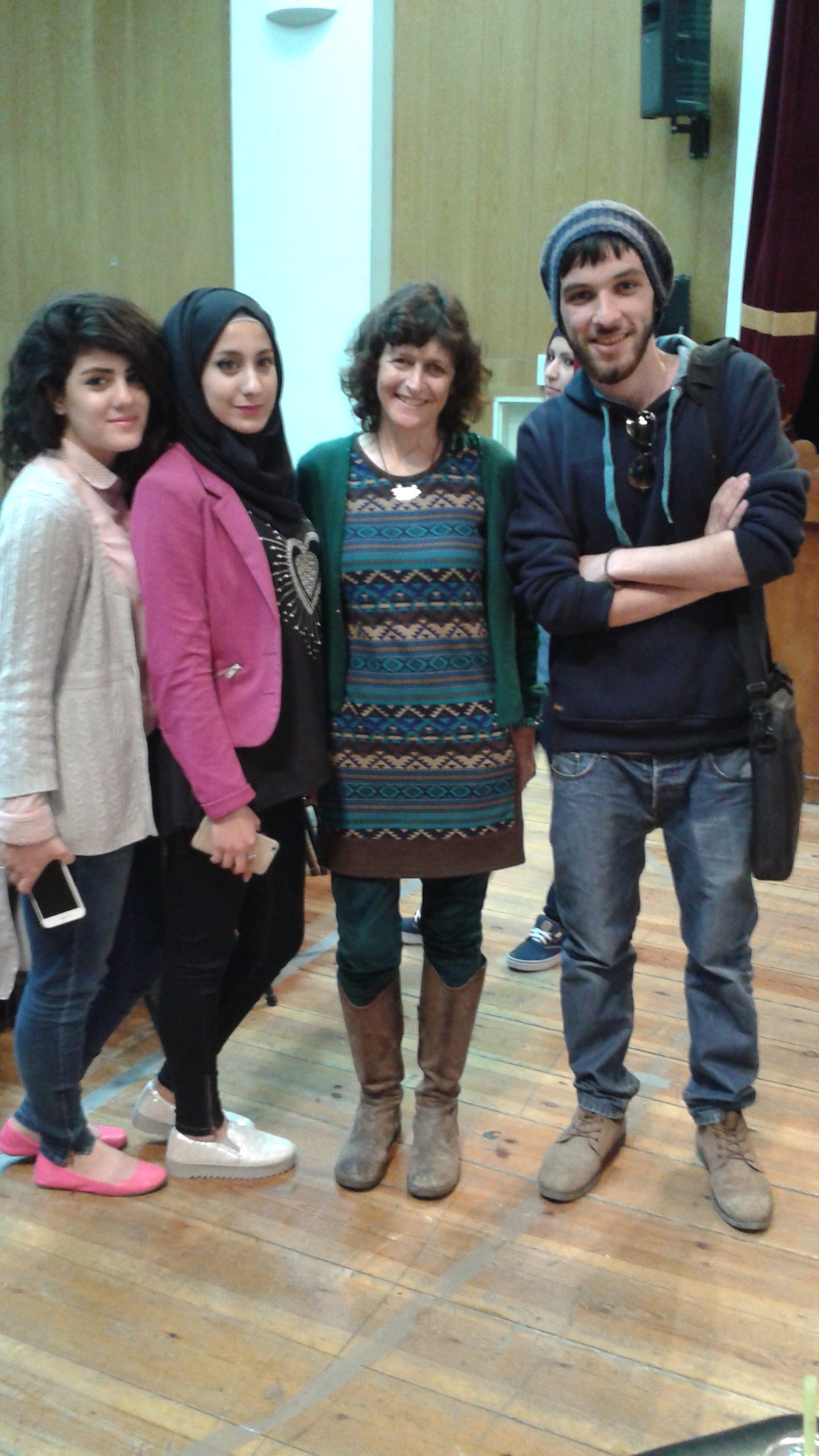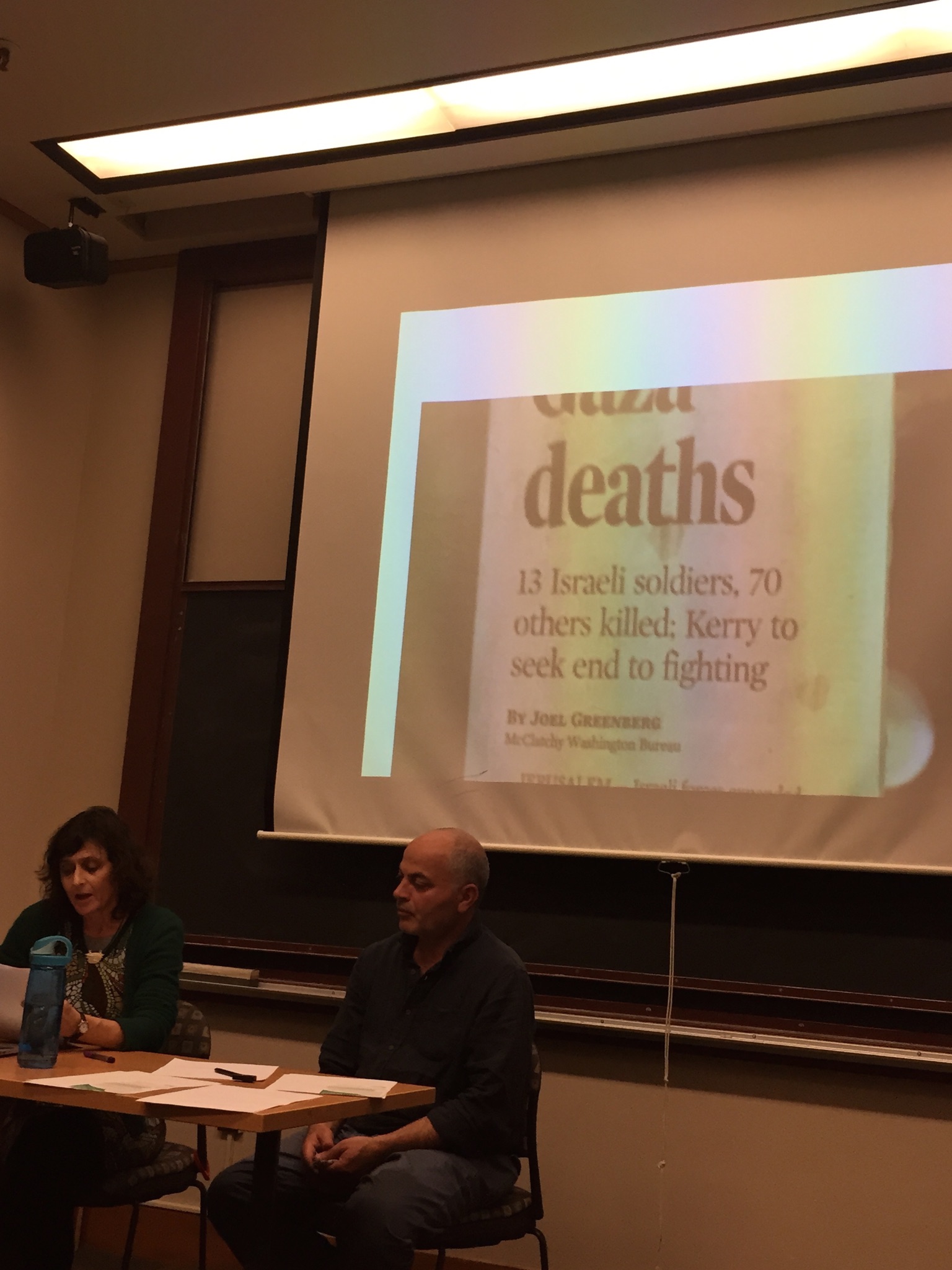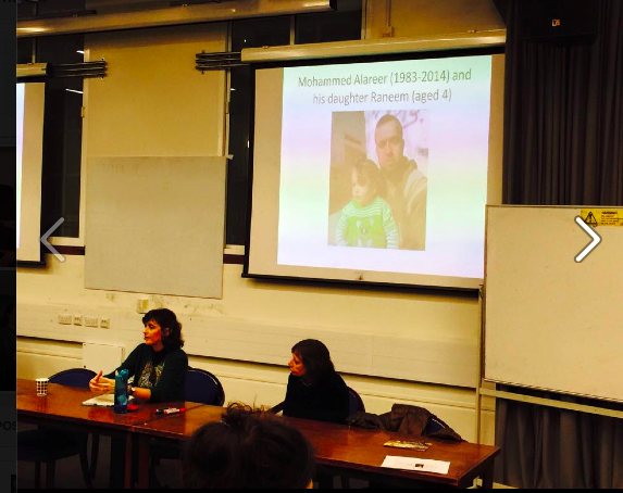 Lina Alsharif, a resident of Gaza, and a mother, currently based in Qatar, is a poetess and a former student of Alareer. Since she was a university student at IUG in Gaza, she has been blogging and writing. Alsharif joined the lecture via Skype as she has been unable to visit her family in Gaza for more than three years. In locked out, her contribution to Biography, Lina spoke of being away from family and how it felt. “When my friends ask me “Why are you staying behind? Why don’t you go home?,” my mind starts whirling, for how am I going to explain how I am being stripped of the very basic, the very ordinary, the very human right to be reunited with my family in Gaza-Palestine.” Alsharif spoke of her concern of having her daughter to grow up away from her family, as her little daughter joined the conversation by producing some noise, to the delight of the audience. “Living in Gaza and then diaspora makes you reflect on how miserable life is back home and how it should be. This gives you a constant sense of displacement. Writing about it is a way to tell the world but also away to release this constant frustration and longing to be with loved ones.”
