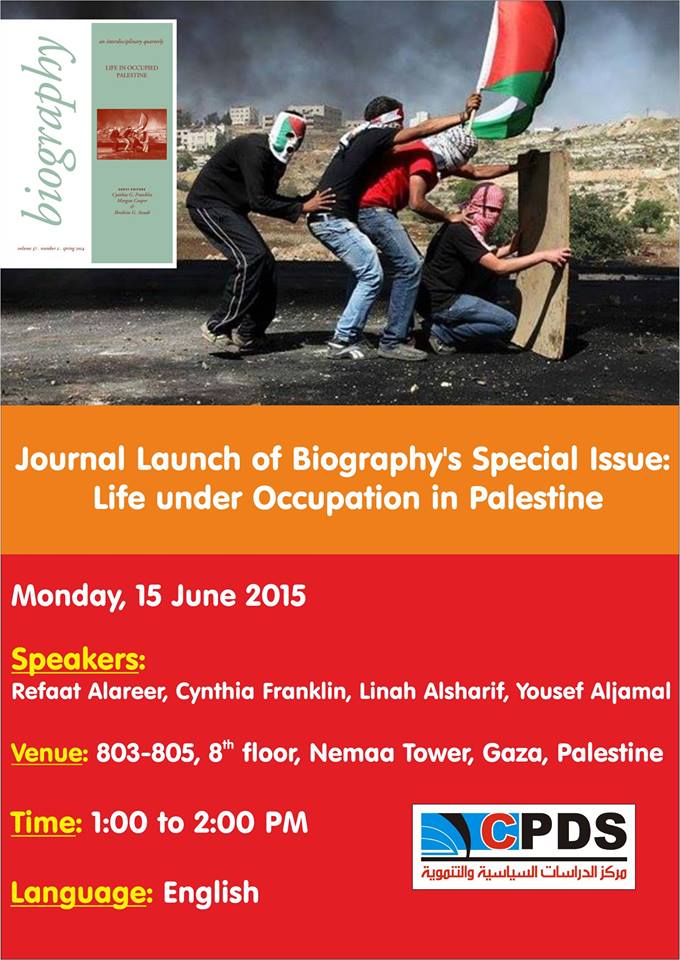 The Center for Political and Development Studies in Gaza, Palestine held a launch of Biography’s Life in Occupied Palestine, a special issue highlighting the life of Palestinians under occupation. Cynthia Franklin, Morgan Cooper and Ibrahim G. Aoudé have co-edited the newly released special issue, which has 17 authors, who contributed various articles addressing aspects of life under occupation and hardships and aspirations of Palestinians and their means to resist the Israeli occupation. The stories include writers from all parts of Palestine, which makes it a particularly an important issue.