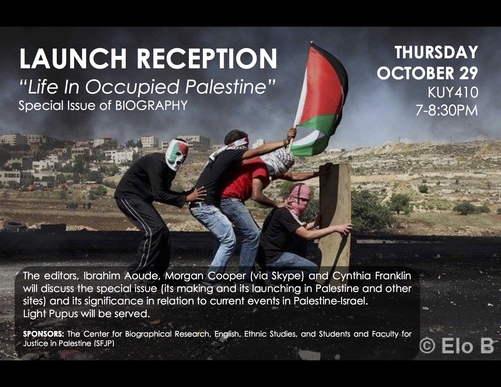 HONOLULU: Launch / Reception at the University of Hawai’i on Oct. 29, 2015, 7-8:30 pm. Co-sponsored by the Center for Biographical Research, the English Department, the Ethnic Studies Department, and UH Students and Faculty for Justice in Palestine (UH-SFJP)