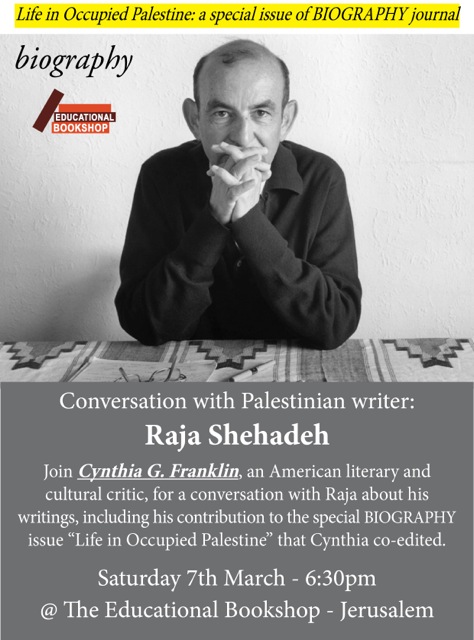 “‘Life in Occupied Palestine’: Life Narratives in the Context of Israeli Settler Colonialism.” Mada el-Carmel, Haifa, Thurs., March 12, 2015, 5 pm. Featuring Nadera Shalhoub and Raja Shehadeh, with Morgan Cooper and Cynthia Franklin.