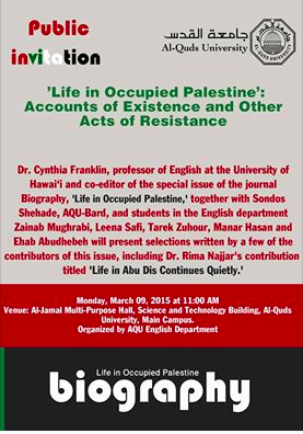 “‘Life in Occupied Palestine’: Accounts of Existence and Other Acts of Resistance,” Al-Quds University, Abu Dis, Mon., March 9, 2015, at 11 am. Featuring Rima Najjar, Sondos Shehade, Cynthia Franklin, and students in the English Department at Al-Quds.
