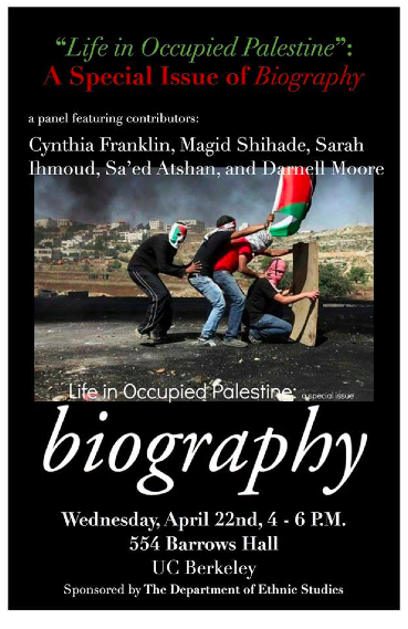 Panel on “Life in Occupied Palestine,” with Sa’ed Atshan, Cynthia Franklin, Sarah Ihmoud, Darnell Moore, and Magid Shihade. UC Berkeley Ethnic Studies Department, April 22, 2015, 4-6 pm.
